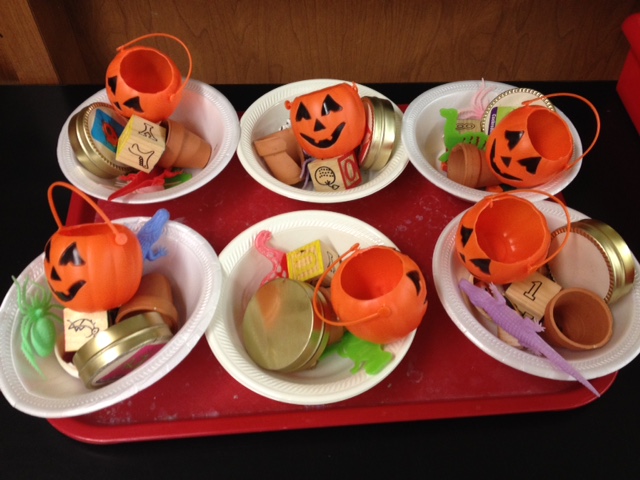 For the “Bowl of Fun!” lab, I gather fun random objects from the dollar store (this usually falls in October so I try to include Halloween themed objects like mini jack-o-lanterns and spider rings!). The students practice making precise massings of objects of their choice from the bowls!