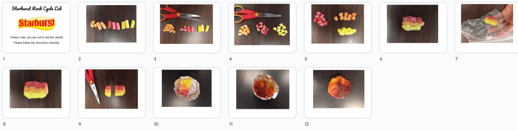 Simply label a counter or large table with numbers (I use 12 rocks and I use colored duct tape to label) and have students write #1-12 on an index card. They will observe the rocks and write if each is igneous, sedimentary, or metamorphic. If necessary, you could project a slide on the classroom screen with an outline of features to look for in each type of rock.